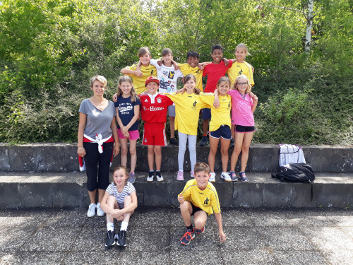 mit einer herausragenden Einzelleistung von Noah D. (4. Kl.), der 7,53 sek auf 50m lief und 4,70m weit sprang, was Herr Wahl eindrucksvoll mit einem Maßband darstellte!